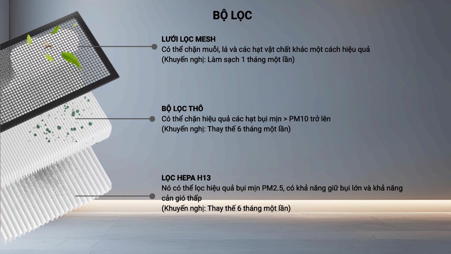 Máy cấp khí tươi Hagisu sử dụng bộ lọc tĩnh điện IFD và bộ lọc HEPA H13, giúp loại bỏ gần như toàn bộ các tạp chất, vi khuẩn, vi rút, và bụi mịn, mang đến không khí sạch sẽ và an toàn cho các thành viên trong gia đình. Các bộ lọc này không chỉ giúp diệt khuẩn, nấm mốc mà còn bảo vệ sức khỏe gia đình bạn khỏi các bệnh về đường hô hấp, như hen suyễn, viêm phế quản, và cảm cúm.